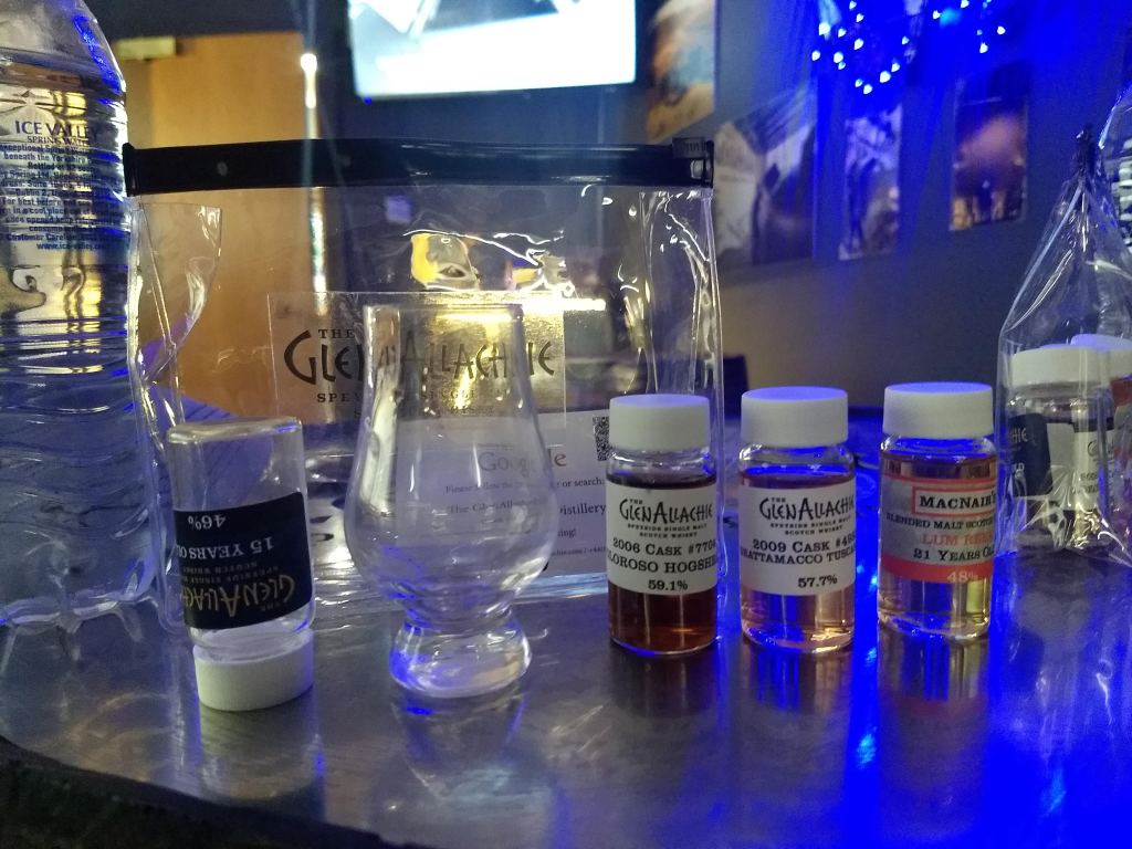 Tasting: 4x20ml drams, GlenAllachie 15y, two distillery exclusive single casks 2006 ex-oloroso hhd and 2009 Grattamacco finish, MacNair Lum Reek Blended Malt 21y. Complimentary mini glencairn.