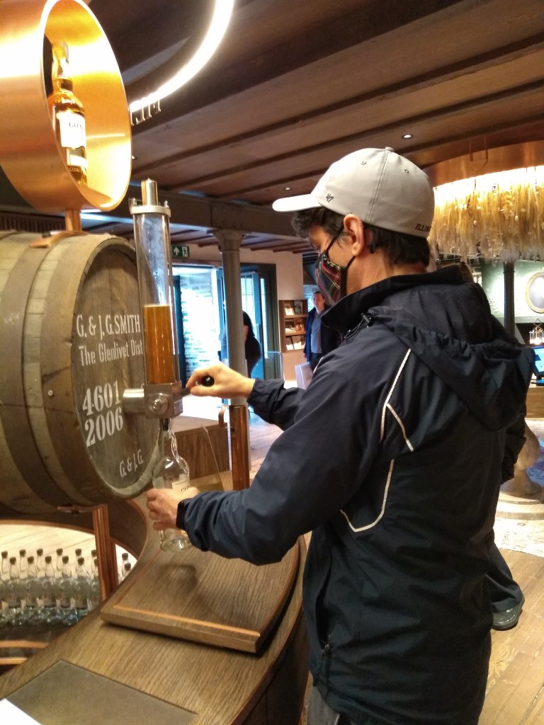 The Single Cask bottles at the shop were a bit expensive (among the ones we tried, the cheapest was £85 for a half-litre bottle), so we decided to buy a “bottle your own” expression. They had three, all cask strength but not single casks: a 12y (£55 for a 70cl bottle), a 15y (£70 for 70cl) and an 18y (£110 we think, but we might not remember correctly); we chose the 15y, whose cask make-up reminds a lot the one of their 15y core range, although this one is not chill-filtered. To note the impressive collection of Glenlivet expressions available at the shop, as well as whisky from other Pernod-Ricard distilleries (these ones in the single casks range).