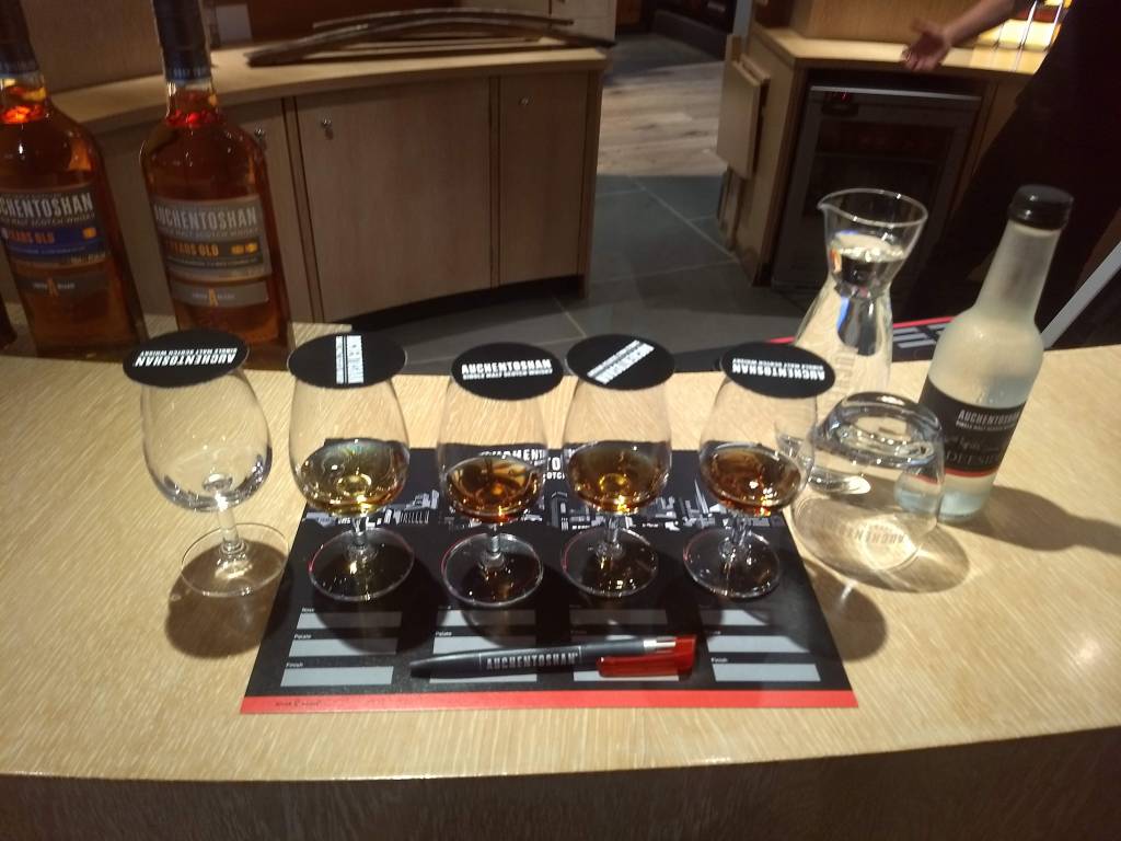 The other two guys joining us were not so lucky, and they started the tasting a bit wet. The tasting we had chosen was the Auchentoshan Masterclass. A particularity of this distillery is that, unlike many others in the Highlands which used to dry their barley with peat before the train lines were built, Auchentoshan never did that. Of course, this is because they are in Glasgow, which granted access to coal much earlier. We were very curious about this distillery, of which we already had a couple of bottles. Although the American Oak expression is fair for the money you pay for it at some grocery store, the Three Woods one already shows a bit of character (maybe for the 43% abv instead of 40%?). The tasting was guided by Douglas, which definitely knew his drams! During the tasting we found out that he’s from the same village as the other two guys (and we will find out later that one of the guys’ sisters works in the same institute as Gianluigi, although they never met…the whisky world is smaller and smaller!).