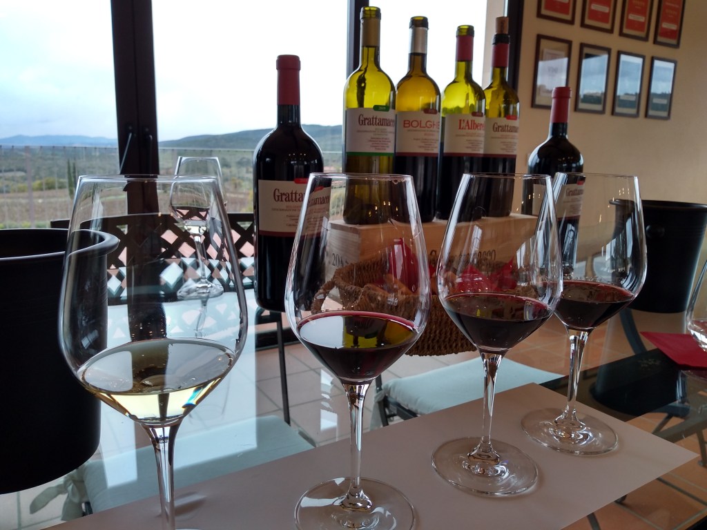 Tasting: 4 glasses of wine – Grattamacco Vermentino (white), Bolgheri Rosso (red), L’Alberello DOC single vineyard (red), Grattamacco Bolgheri (red)