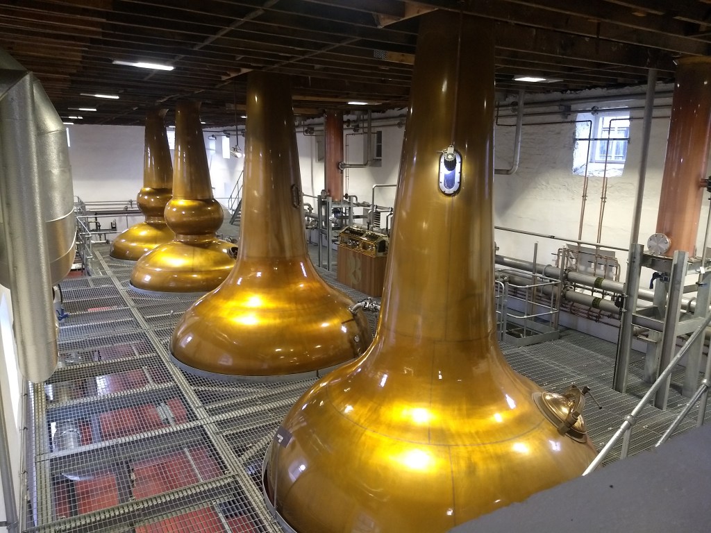 We moved to the still room, where four shiny copper stills (two wash stills and two spirit stills) were actually working! It was very nice to see the liquid been distilled through the wash still’s little window.