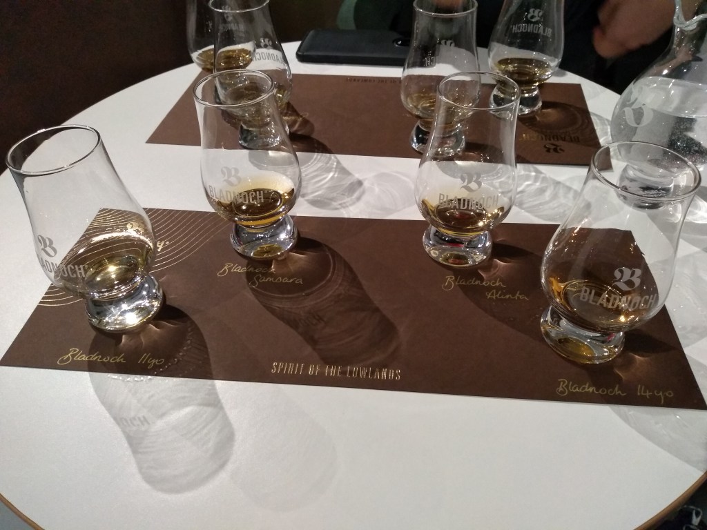 Tasting: Bladnoch new make spirit (63.5%), 11y/o (46.7% , NCF, NC, ex-bourbon casks), Samsara (46.7%, NAS, NCF, NC, California wine and ex-bourbon casks), 14y/o (46.7% , NCF, NC, oloroso sherry casks), Alinta (peated, 47% , NAS, NCF, NC, 1st fill ex-bourbon and 1st fill ex-sherry casks)…and the glencairn to take home