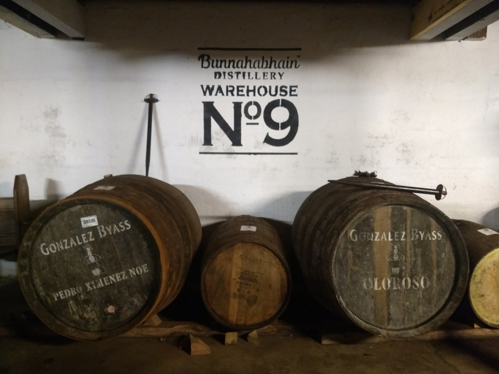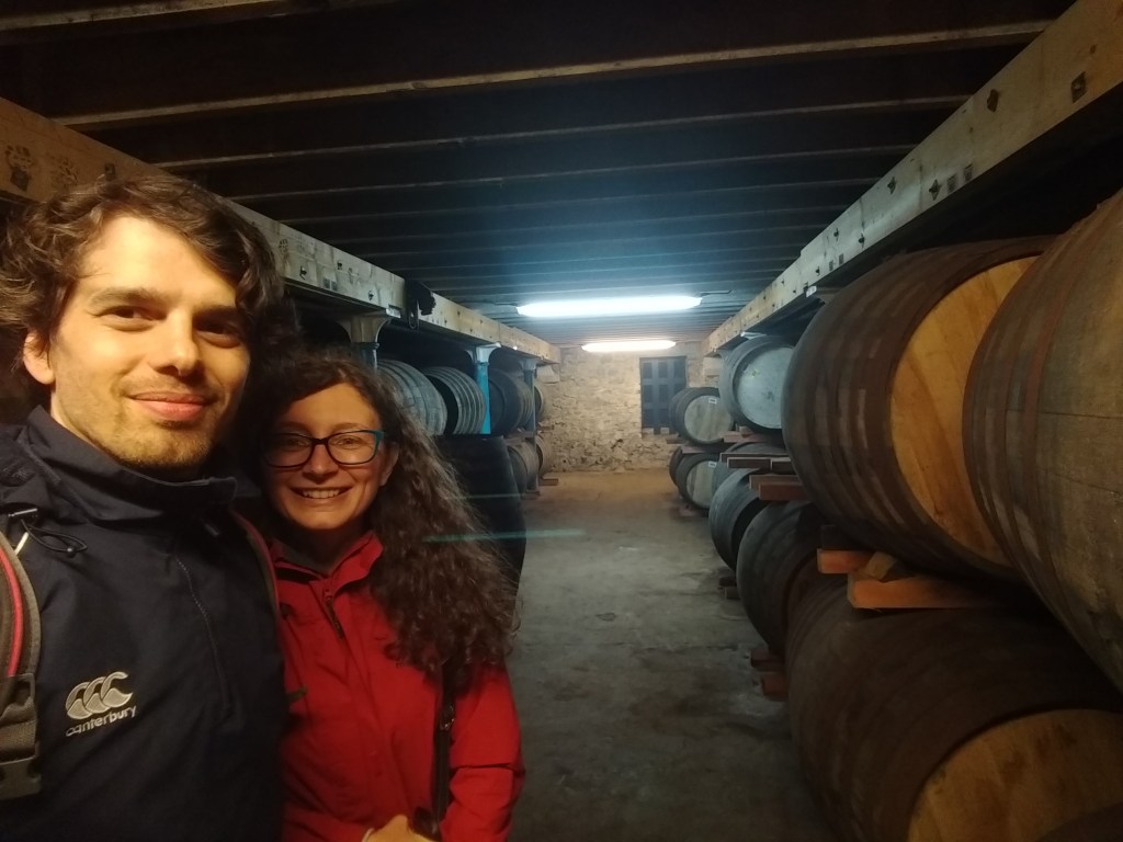 We were quite a large group, 13 people, which coming out of 2 years of pandemic seemed even bigger! But of course, there was place for everyone on the benches around the 4 casks. The mood was already up to the sky and we both had smiles larger than our faces. Colin was very knowledgeable and funny, he definitely played a big part in our experience. We later found out that he is the co-host of the Attic Islay podcast… we wish we would have known before that! (We also learned from his social media that he moved on soon after, so the best of luck to him!) The first sample was one of the last few bottles from a cask that was just replaced: a beautiful and pale 17y malt from an ex-manzanilla sherry butt. As a starter dram, it set the bar quite high! Second off, a weirdly pale ex-PX Noe which was extremely silkie and sweet, another belter. According to Colin, the reason why the whisky came out so pale after 17 years in an ex-PX cask is because this might have been the one on “top” of a solera system “pyramid”, so the sherry might not have had the time to give the typical dark colour, which in some cases can be as deep as coke (note: solera systems casks are not necessarily physically on top of each other, but it’s easier to explain it this way). Teresa won a sample of the ex-PX Noe by being the closest to guess the year in which the Bunnahabhain flagship expression 12y went on sale: 1979 (Teresa’s guess was 1981, Gianluigi’s 1972). The last couple of casks were very new in the line-up, and since Colin was still recovering from his Covid-caused loss of smell and taste he told us he had no idea about how they tasted… what a shame for him! The third dram was a peated matured for 17y in an Oloroso butt, this time a dark, very earthy and oily dirty dram, like chainsaw fuel but in a good way. The final dram was truly one of the best whiskies we tried: 19 years of age, the first decade spent in a refill ex-bourbon hogshead, the final 9 years in an ex-Heaven Hill barrel. Truly wonderful stuff.