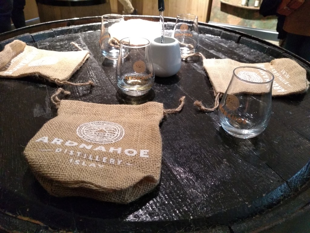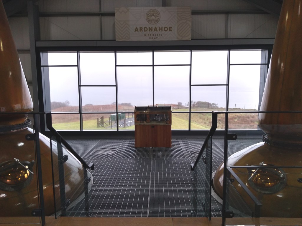 Finally, 4pm. The tour started in a room adjacent to the visitor centre, where our guide explained the history behind the distillery, which started producing new make spirit only in 2019. We quickly moved to the production area, where we admired their Bobby mill, one of the very few existing. It was followed by the copper covered mash tun, their wooden washbacks, and in particular their stills, which have the longest lyne arms in the Scottish industry (they are really long!). These arms take the distillate to worm tubs condensers, a unique feature among Islay distilleries. Unfortunately the tour didn’t include the warehouse. We were brought back in a tasting room, where we could choose a dram among four: the Islay and Highland Journeys (two regional blended malts), a Hunter Laing Glengoyne and the Scarabus single malt (from an undisclosed Islay distillery). We chose the two blended malts, which were ok but not very memorable. More interestingly, we got offered a taste of the new make spirit: on top of the usual pear and green apple aromas we tasted in other mew makes, this one also had lot whiff of bananas and, of course, smoke.
