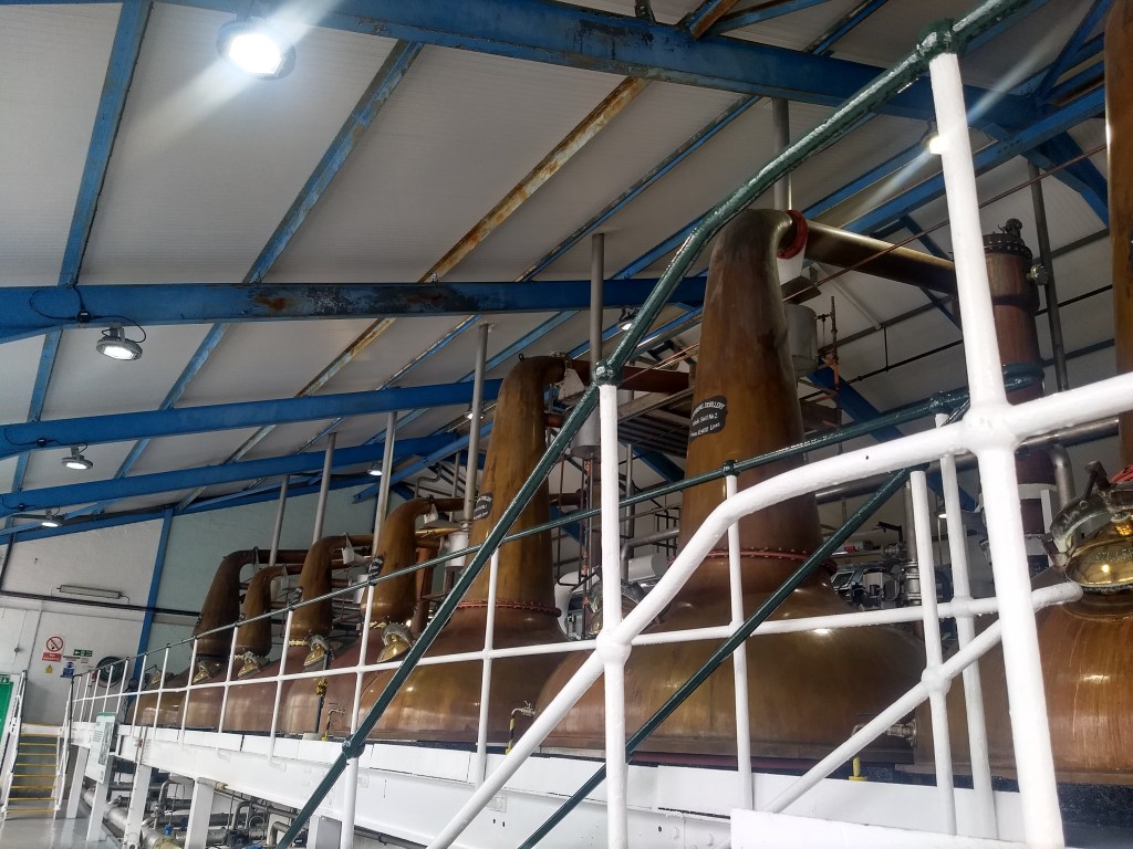 The tour went through the rest of production, up to the still room, in a separate building. One of the 7 stills is definitely bigger than the others, but we were told that all the spirit produced is mixed together anyway (also the spirit produced with the sourced and their own malted barley is mixed).