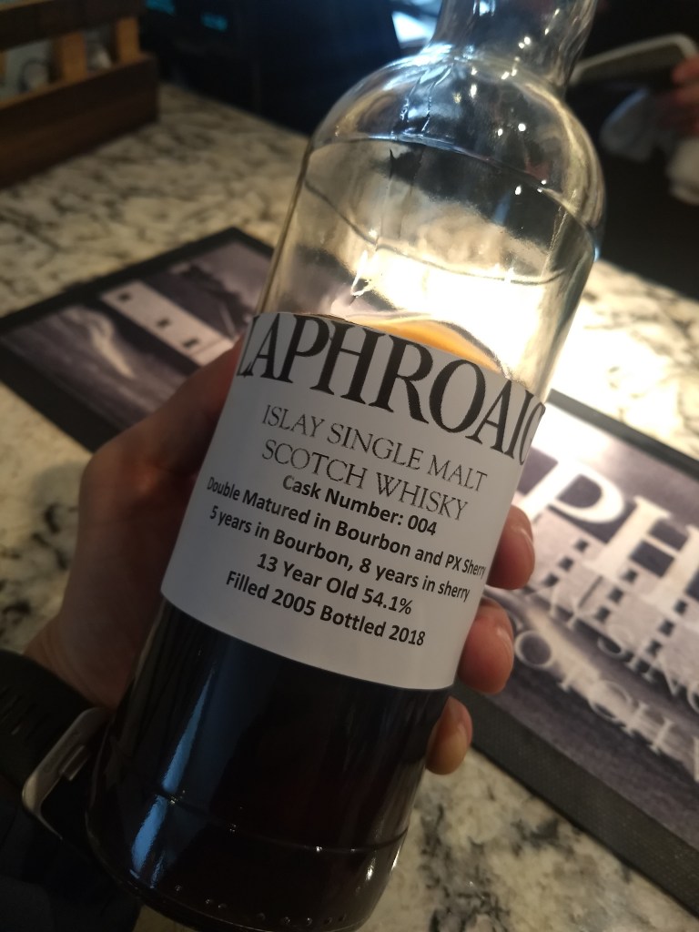 Back to the visitor centre, itโ€™s time for the tasting. Other than the lanyard and the wee glass, Caroline gave us three tokens each, which we could spend to get some of the available drams: 1 token for the regular Laphroaig 10 and the Select, 2 tokens for the 10y cask strength, etc. An opportunity to custom the tasting experience, we both thought this is very smart. We had 6 tokens between us, so we opted for the Lore (2 tokens, never tried before), the Quarter Cask (1 token, tried a long time before) and the Cairdeas 2021 bottling, finished in ex-PX casks (the only 3-token dram). At the bar, we had some light snacks and a dram from the warehouse tasting cask (the only available to try, not to buy), a 13y which spent 5y in an ex-bourbon and 8y in an ex-PX cask: really delicious!
