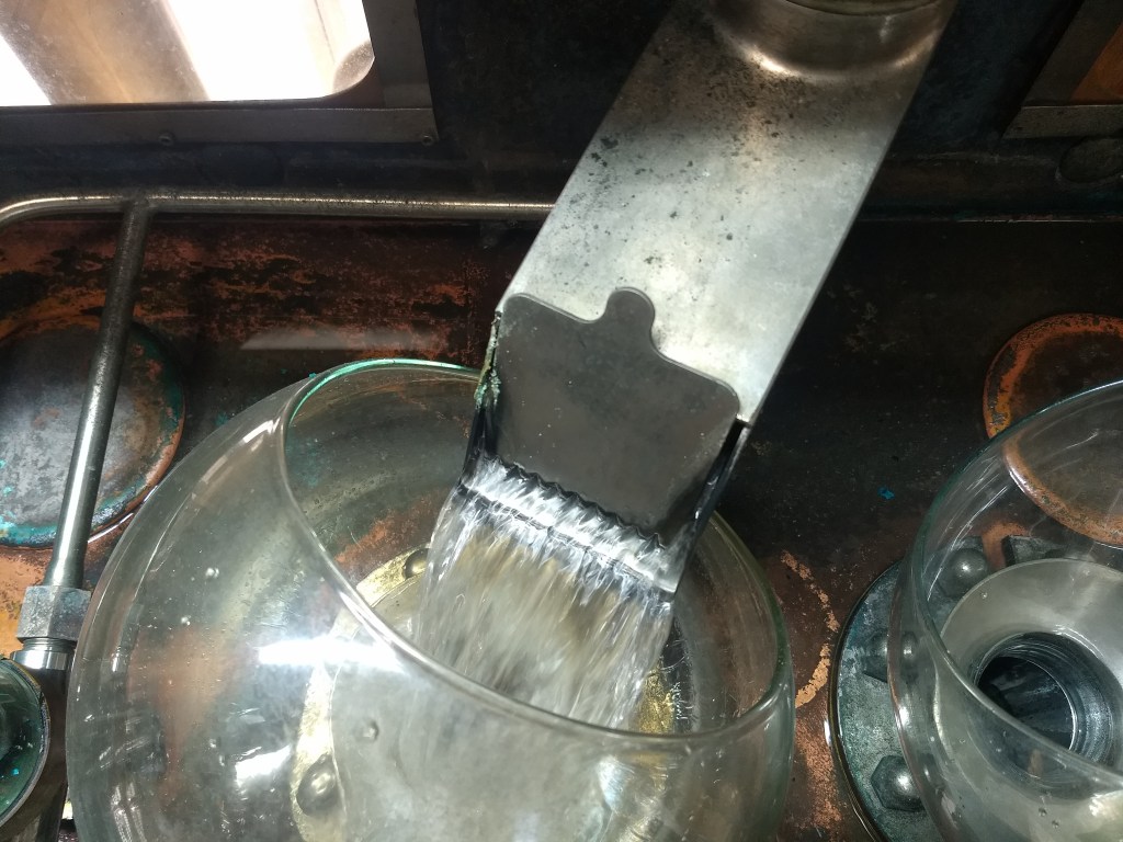 We moved on to follow the phases of whisky production: milling (classic red-painted Porteus), mashing (again, closed stainless steel mashtun), and fermenting (stainless steel washbacks). In the still room, we saw the other result of the renovations: they removed one of their three stills, and the spirit still is now directly fired (a flame is burning below, heating the still, instead of the usual steam coil inside it). Again, this modification is a step back into the past of whisky production, as direct-fire stills aren’t usually as efficient as steam coils. Their cut is wide, 73% to 63%, which contributes to giving body to the spirit.