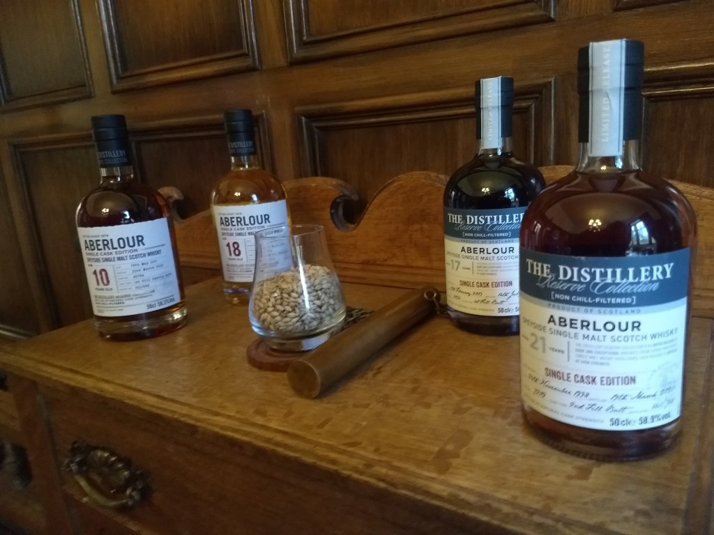 The first visit of the morning was at a distillery we already knew, Aberlour, but that we have overlooked since our visit in 2019, except for a bottle of A’Bunadh which for a while was our “Teresa’s mother house dram”. Reasons being, their other core releases are a bit dull in our opinion, and there are not many independently bottled. The distillery, however, offers many single cask bottlings (the Distillery Collection). This is a feature of all distilleries owned by Chivas Brothers/Pernod Ricard (Glenlivet, Scapa and Strathisla): they have many bottlings from the distillery and sometimes from the others. Only down side: they are 50cl bottles priced like 70cl ones. We personally have nothing against smaller bottles – we like exploring, so smaller bottles allows us to get more variety, in theory a win-win. However, in some cases (included this) we feel like they are just an excuse to sell less at a higher price.