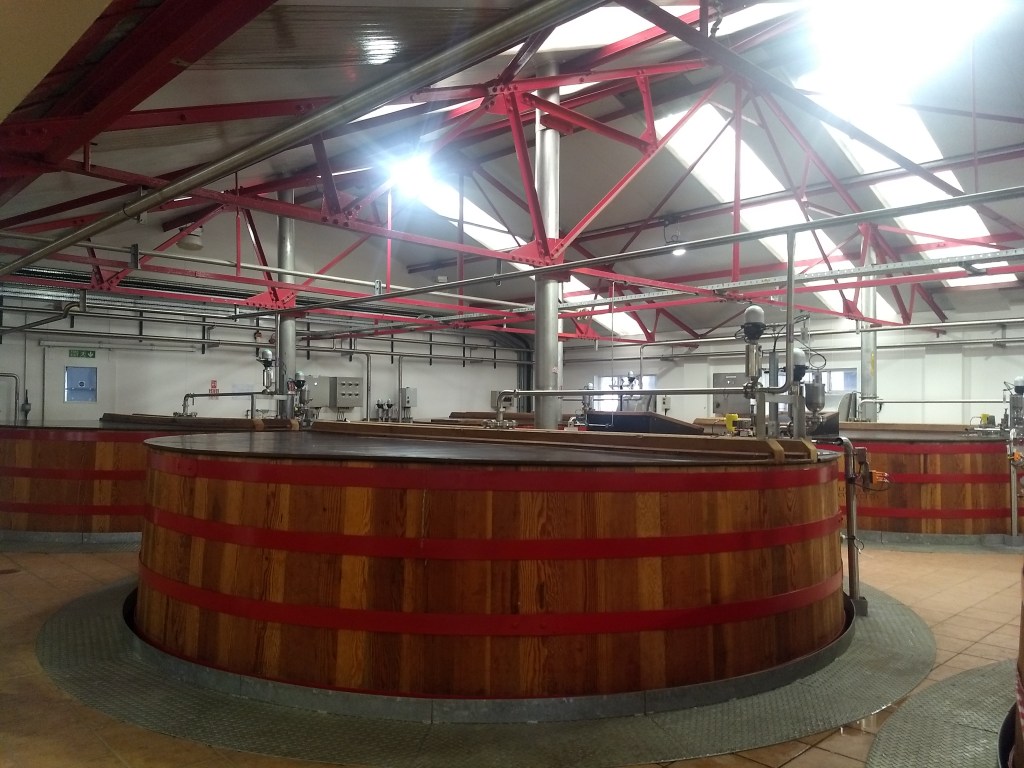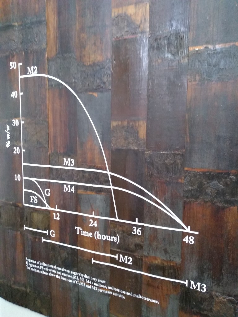 The walls of the fermentation room, where six Douglas Fir washbacks are located (wooden because of a combination of aesthetics and convenience, since they can be disassembled unlike stainless-steel ones, all replaced in 2016), are decorated with some nerdy facts about whisky making, like the formula to calculate the % abv of the wash using the gravity readings, and the graph showing the trends of different types of sugars digestion during fermentation. Their fermentation time is usually between 55 and 59 hours, never less than 50, and they work with yeast that can survive higher temperatures, around 35C.