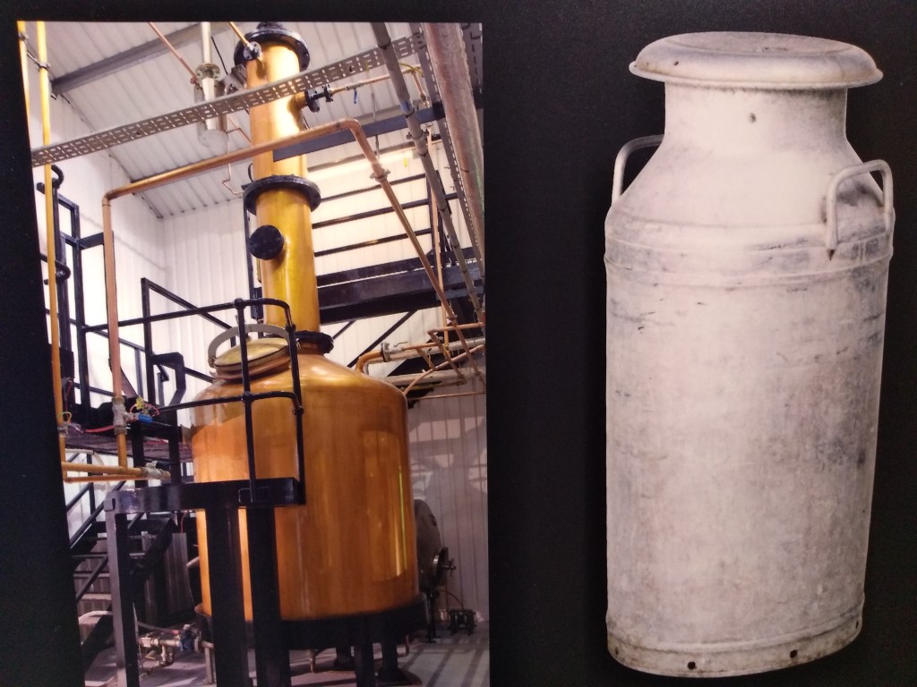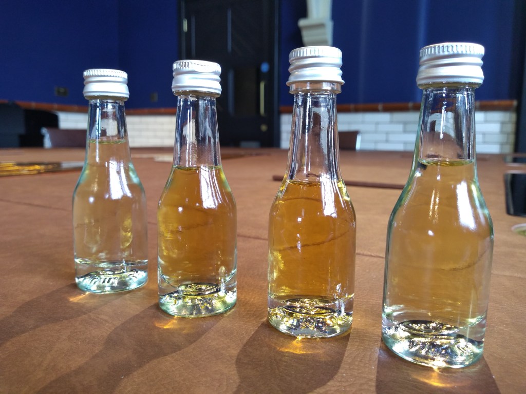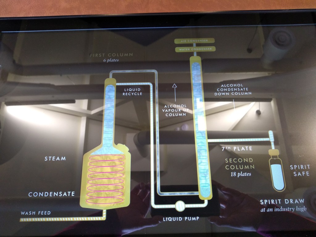 When the tour started, Carmel collected us, and the first thing was a video in a small room. As usual, the video talked about the distillery history and how they came to be. We then went outside, and across the site, to start the visit to production (again, no pictures allowed). Bar for the gin still (where they rectify neutral grain spirit), the distillery is very similar to a Scottish one. Their stills, made of copper, have a couple of interesting bits however: first, the spirit still has what we think itโs a cooling ring around the neck. This is a feature we found at Fettercairn, although they didn’t look the same. The second feature is a stainless steel condenser in parallel with the copper one. Carmel told us this one is rarely used, mostly for special bottlings and not for their core release. And in fact, one of the most interesting parts of the tour was to compare the newmake spirit from the two condensers, just nosing however. The difference was obvious, with the steel condensed spirit more earthy and oily, the other fruitier and more floral.