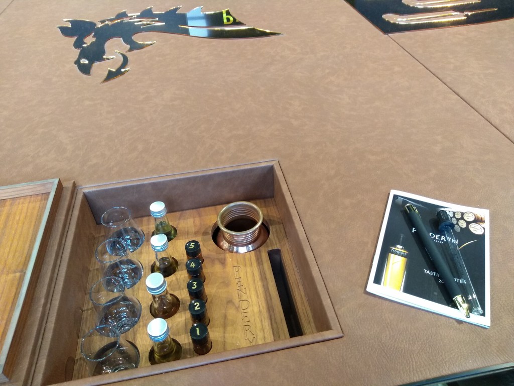 In spite of the gloomy day, the location looked still very pretty: the distillery is at the end of a road with a parking lot, on a land crossed by a wee stream, surrounded by a rural landscape. The building on the left is the bar/visitor centre, with tables outside for warmer and dryer days. The production building is on the right side instead, along the stream. Past the bridge to cross it, a red copper dragon welcomed us. The visitor centre looked very tidy and clean, with lots of merchandise on the shelf. We looked for potential whisky buys right away, but it seemed that the only expression beside their standard release was a 3yr ex-Sauternes cask finish from the Distillerโs Cut series, bottled at 47% (ยฃ75). We were told that they usually have either a Distillerโs Cut or a Distillery Exclusive.