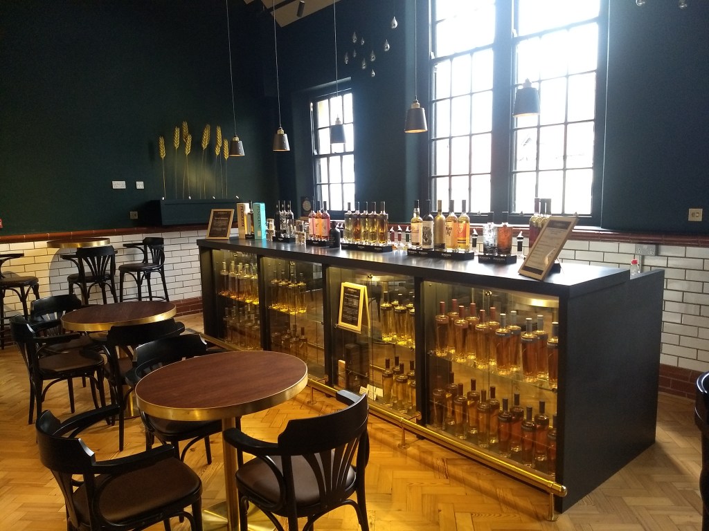 For the end of the tour, we went back to the visitor centre, to try an array of spirits: gin, gin liqueurs and their single malt. We skipped most of the gin liqueurs, as from smelling them we figured out they weren’t for us. The bar was open for another hour, so we went there with the idea of trying some of their Distillerโs Cut and Distillery Exclusive, whose bottles were sold out. However, the price for a dram was ยฃ14 (mental!), so we tried one only, Barolo red wine cask (well, weโre still Italiansโฆ) Distillery Exclusive, which was ok. Fortunately, we managed to find Carmel again, and she kindly gave us a sip of the current Distillerโs Cut, from ex-Sauternes casks, but this one failed again to impress.
