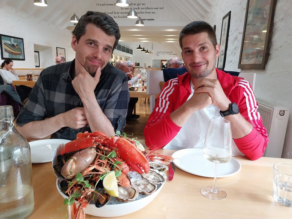 Our ferry was booked for the evening, so we did a few stops in between: Fyne Ales brewery (always very tasty pints) and for lunch at Loch Fyne Oysters, pricey but the array of seafood we ate was exceptional! We also briefly stopped at the George Hotel, Inveraray, to say “hi” to our friend Ivan (and for Gianluigi and Edo to get a dram…Teresa was driving at that point). As we drove towards Kennacraig, the weather got worse, so much that they changed our destination, Port Askaig instead of Port Ellen (sad trombone sound). The wind was howling on Islay as well, but we drove straight to our parking for the night, while admiring some piles of peat drying out along the way. We parked our van next to Justine’s Post Dram Prat and had a small meal and a few drams (the Ardray, a new Suntory blended scotch, was the surprise of the evening), before slowly drifting to bed.