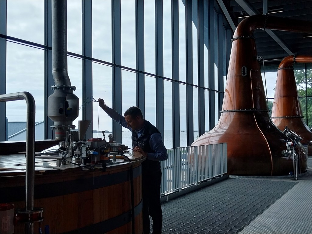 One great feature, instead, is their use of mostly renewable sources for energy. The distillery was (re)built with the intention of making it as carbon neutral as possible, which is very valuable. As we moved to production, Allan showed us their permanent lab, which is quite unique: here, a full-time analyst checks the peat levels in the barley and the spirit, thus serving both the distillery and the maltings.
