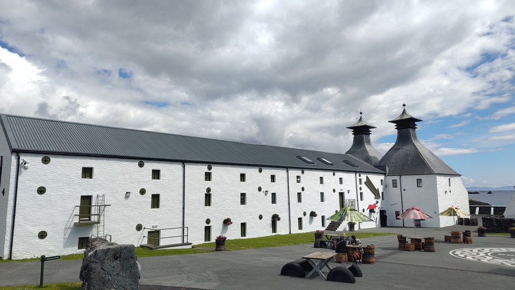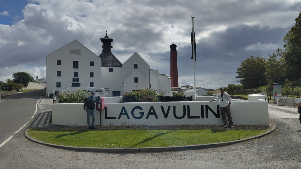 We soon jumped on the van and drove all the way down the island, past Port Ellen, to the Kildalton coast. There, we had our first (and only) tour booked for the day, at the Lagavulin distillery. We had visited it before, but for one of their warehouse tastings, at the time (May 2022) hosted by the legendary Iain McArthur, who recently retired. This time, we were going to visit production, to find out how they make the stuff. Before the tour started, and after Justineโ€™s White Horse miniature photoshoot, we had a coffee at the Malt Mill bar, in the building of the former namesake distillery. This was a โ€œshort-livedโ€ (well, still over 50 years!) distillery built by Peter Mackie in 1908, who aimed to replicate Laphroaig after he lost control of it following a court case loss. However, it quite never made it, so in 1962 the distillery was closed. After the coffee Justine said her goodbyes, as she was going to get an earlier ferry.