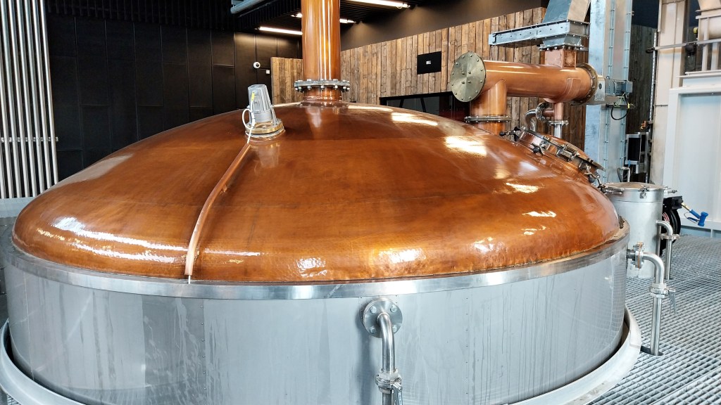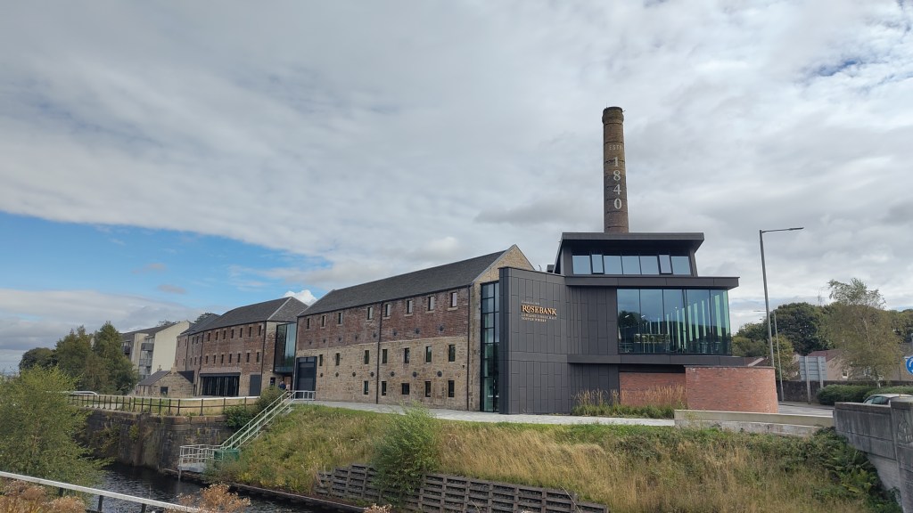 Earlier this year (2024), they also opened to the public. We didnโ€™t go right away – being relatively close and easy to get to for us, we could wait. The perfect occasion came in September: Roy Aquavitae organised the โ€œBarflies gatheringโ€ in Glasgow (or Leg-fest IIโ€ฆIYKYK). The event started in the early afternoon, so instead of taking the train straight to Glasgow, we did a cheeky detour to Falkirk. The train ride from Waverley to Falkirk was quick, less than 45 minutes, and from Falkirk High station it was only a 20-minute walk to the distillery (well, according to Google, turned out to be closer to 15 minutes). We arrived at Rosebank distillery a few minutes earlier, enough time to take a few pictures, a nip to the loo, and check the building from the outside. From afar, the distillery looks like a black block, except for the very recognisable chimney. Getting closer, we realised that it is a beautiful building, very tastefully done, with a big window in the stillroom. The entrance to the visitor centre, though, reminded us of some hotels. The visitor centre also looks like an hotel lobby, while the shop is more akin to a high street boutique.