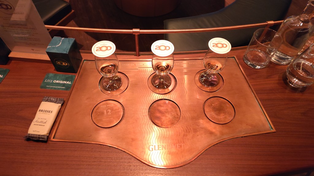 Tasting: 3 drams, Glenlivet 12 (40%), 200th Celebration 14y (48%, 1st fill ex-American oak, ยฃ75), Distillery exclusive 16y (48%, 1st fill American oak finished in refill European oak, ยฃ95), and a complimentary wee glass