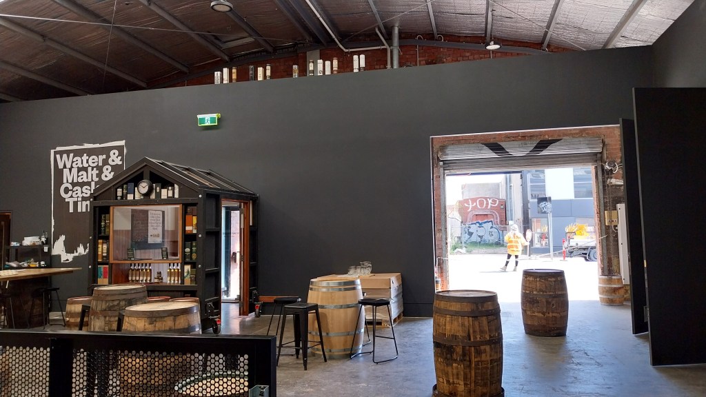 We were welcomed by Pete, one of the distillers and owner’s son. In fact, the distillery was set up in 1999 by David Baker, a former chemistry teacher, who wanted to prove that it is possible to make a good whisky in places other than Scotland. The distillery was originally outside the city, and they first released whisky in 2003. They then moved to within the city boundaries, only a year before our visit, in 2023. Now the distillery is mostly run by David’s sons, Andrew and Pete. Except for a small space they carved out for a shop and a small office, the distillery has two main large areas, divided by a wall. The first one is occupied by the still, a space for tastings and events, and racked casks on the side. The space is also used for other activities, for example while we were there Andrew was preparing their upcoming first blended whisky release (their single malt vatted with Australian grain whisky from ex-bourbon casks, 46%). The rest of production is located in the adjacent area, again with casks racked on all sides.