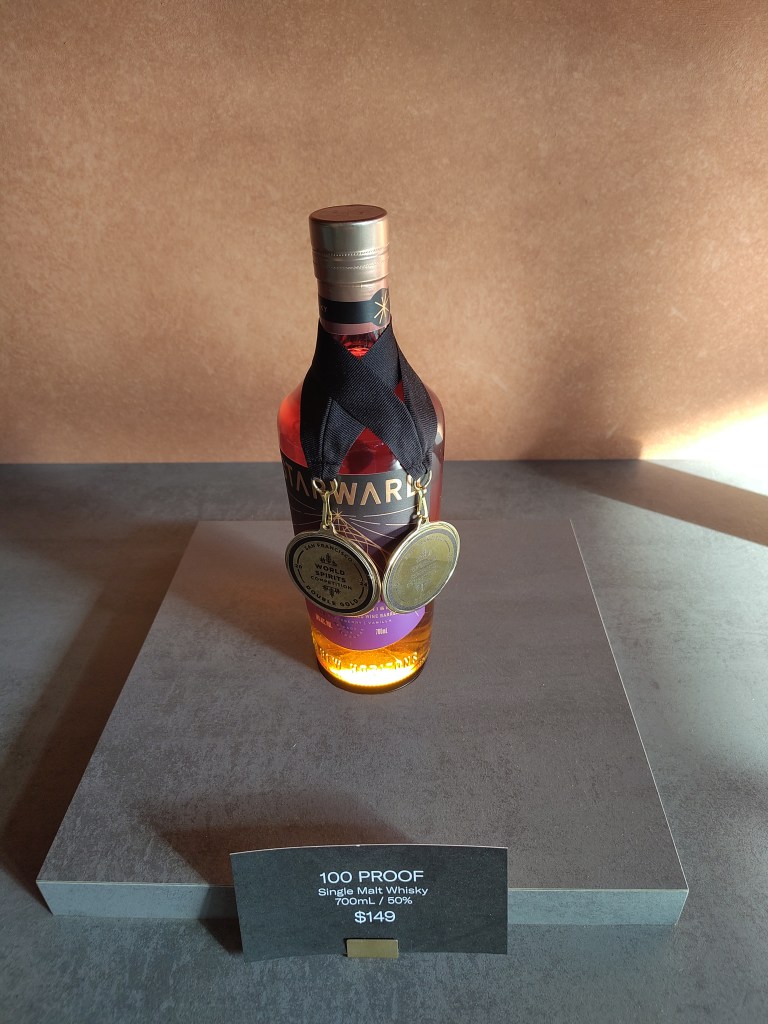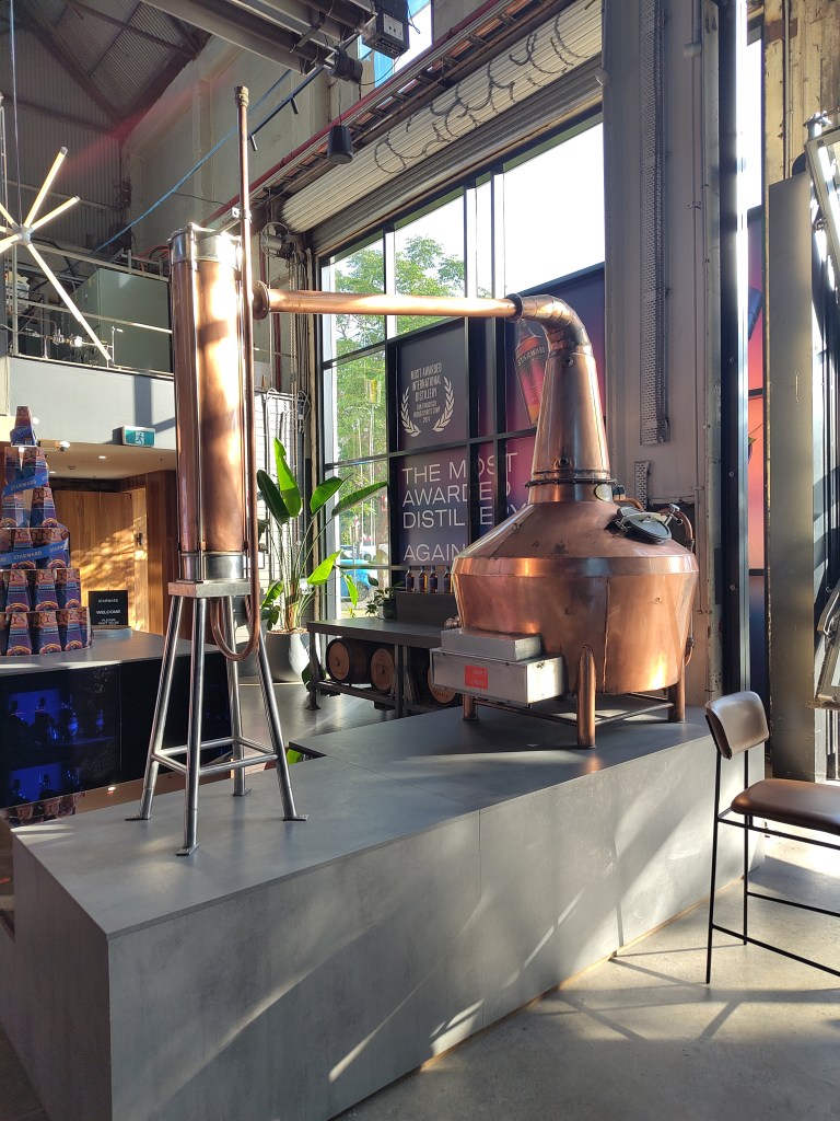 After the tour of production, it was time for the tasting: Starward was one of the few Australian whiskies we’d tried before this trip. Specifically, we’d tried the Fortis, thanks to our subscription to Whisky Me. The tasting started with a blended whisky, the Two-Fold (they have another one, Honeycomb). For this blend of wheat and malted barley, they source the wheat newmake spirit from elsewhere, and they mature it on site. It’s a very basic offering, mostly marketed as a cocktail component, but we found it punchy above its weight, considering it is bottled at 40%, and unexpectedly oily. The second dram was the Nova, matured in ex-red wine casks (French oak) and bottled at 41%. It was our least favourite. Finally, we tried the 100 Proof (name coming from its abv of 50%, so American proof), matured in American oak ex-Pinot Noir casks: this one was delicious, with creamy and red fruits notes, and not too tannic (although, compared to the average single malt drinker, our tolerance for tannins is probably much higher…We “blame” our Italian upbringing).