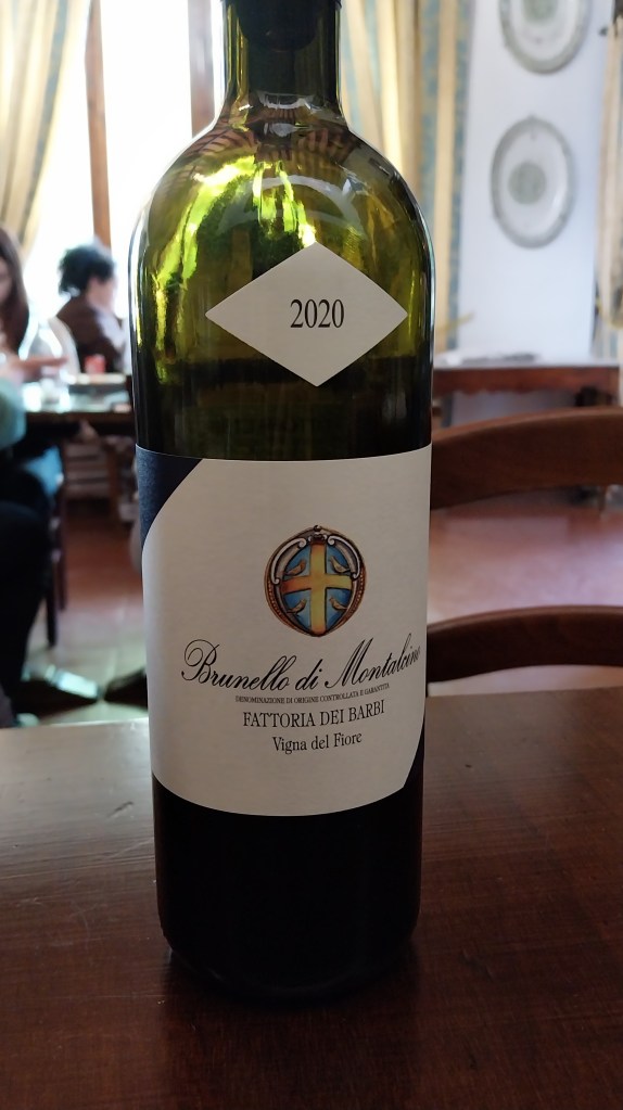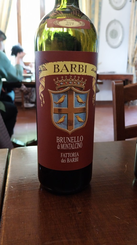 The tour came to an end, and we went to the next building, the bar and tasting room. The basic flight showcased a wide range of products: we started with a white wine, Vermentino dei Barbi (vintage 2023), then moved to a “table wine” called Brusco dei Barbi (2020, 90% Sangiovese and the remainder a variety of grapes). The third wine was their Rosso di Montalcino (2023, 100% Sangiovese grape but not a Brunello). The crescendo ended with their main product, the Brunello di Montalcino (2019, blue label), honestly another level compared to the previous three. The other flight was focused on Brunello, and it took where the previous one left off with the Brunello di Montalcino, followed by another Brunello, single vineyard, called Vigna dei Fiori (2020, white label) which was great, and finally with the Brunello Riserva (2019, red label), truly stunning. We loved the combination of oak and fruitiness in those last three wines.
