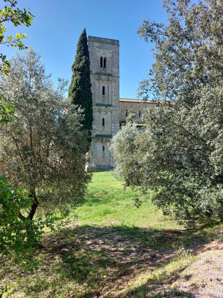 Sant’Antimo Abbey behind the olive trees.