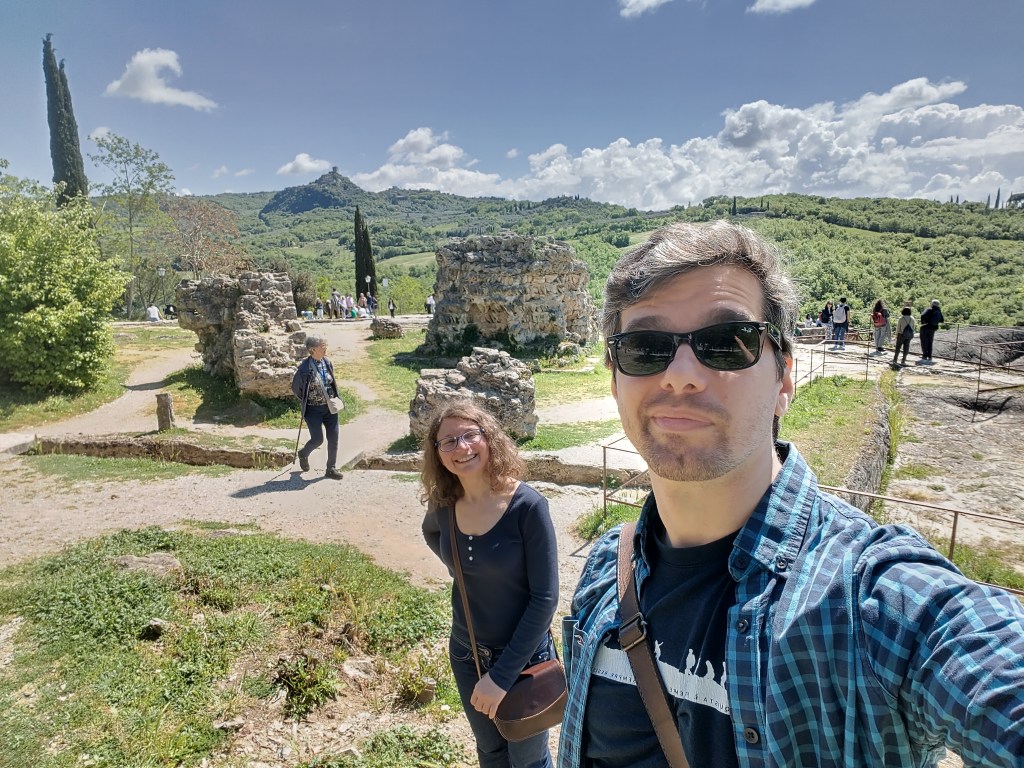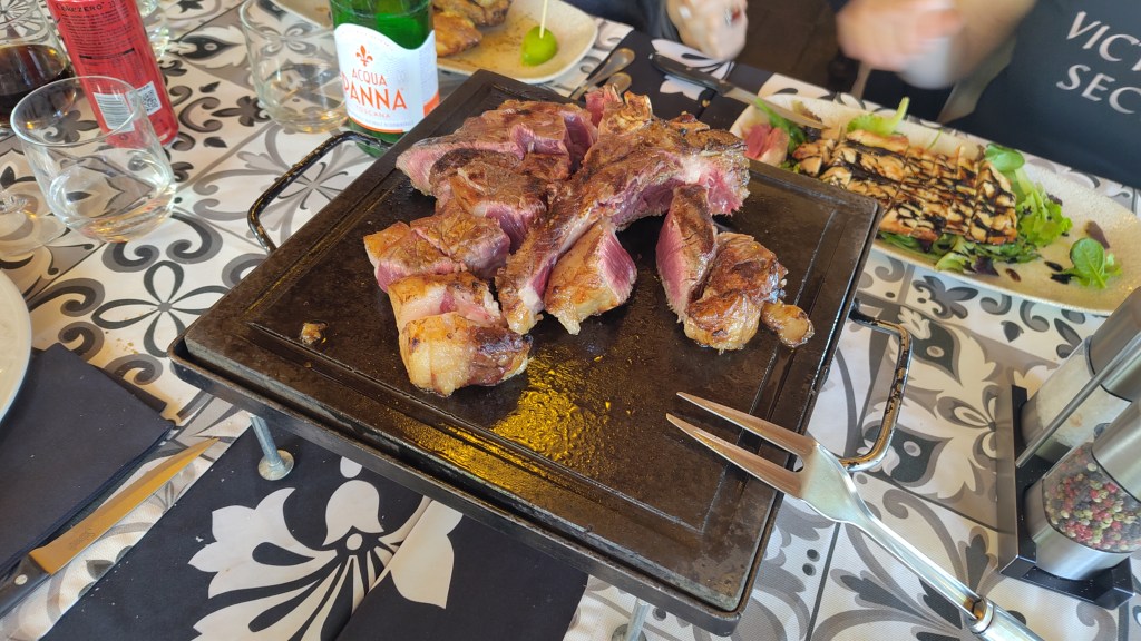 So, what’s better than improving our wine knowledge by visiting a winery in Tuscany? The occasion came in April this year (2025), for Teresa’s mother birthday: together with her sisters, she organised a two-day trip to Val d’Orcia, one of those places that look like a classic Tuscany postcard (wait, it is a Tuscany postcard!) – smooth rolling hills, small medieval towns on top of them, vineyards and meadows (again, not eaten). We left Florence early, and by mid-morning we were in Pienza: a town famous for its pecorino cheese (one of many), and contrary to others, purposedly (re)built by Pope Pius II in 1462, to reflect the ideals of the Renaissance. We then visited the charming Bagno Vignoni (a village famous for a very old spa), before stopping for lunch nearby, where we (meaning Teresa and Gianluigi) shared a very tasty 1.2kg “Bistecca Fiorentina”.