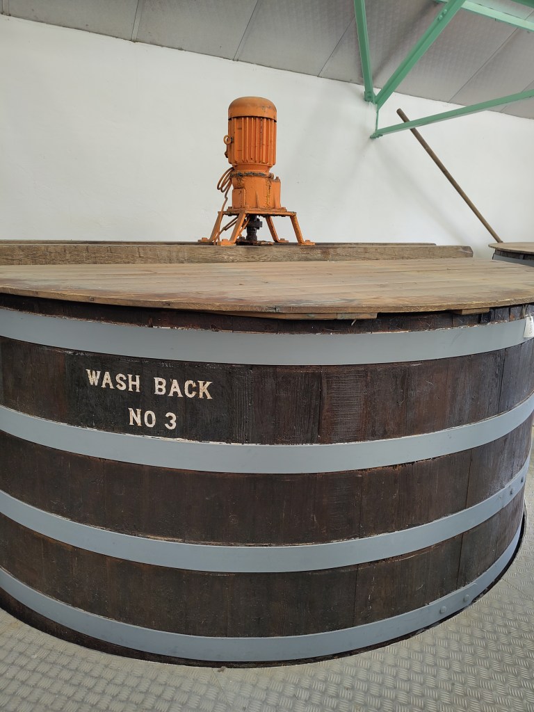 The six 14,000-litre wooden washbacks have been constantly filled and emptied with water to preserve the wood, and in the still rom an ancient fire-engine found also home (probably it will be moved), next to the massive boiler. The distillery has only two stills, but at full regime it can produce about 800,000 litres of alcohol per year, similar size as Glen Scotia, to give you an idea.
